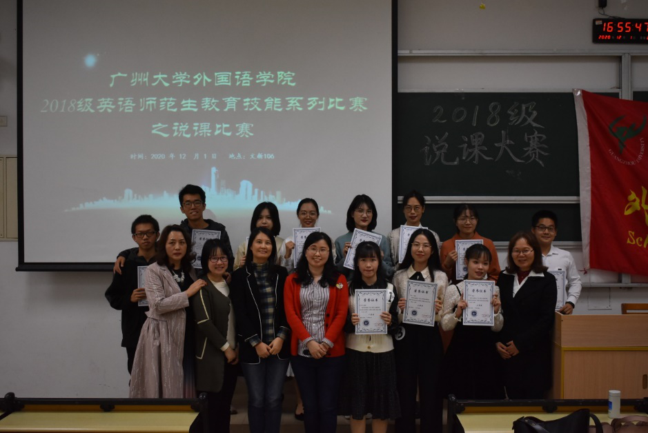 省级教师教育示范基地--广州市番禺区大龙中学麦焕炎老师和广东省实验中学越秀学校李小华老师以及英语师范教研室全体教师。18级全体师范生和19级师范生代表观摩了本次比赛。