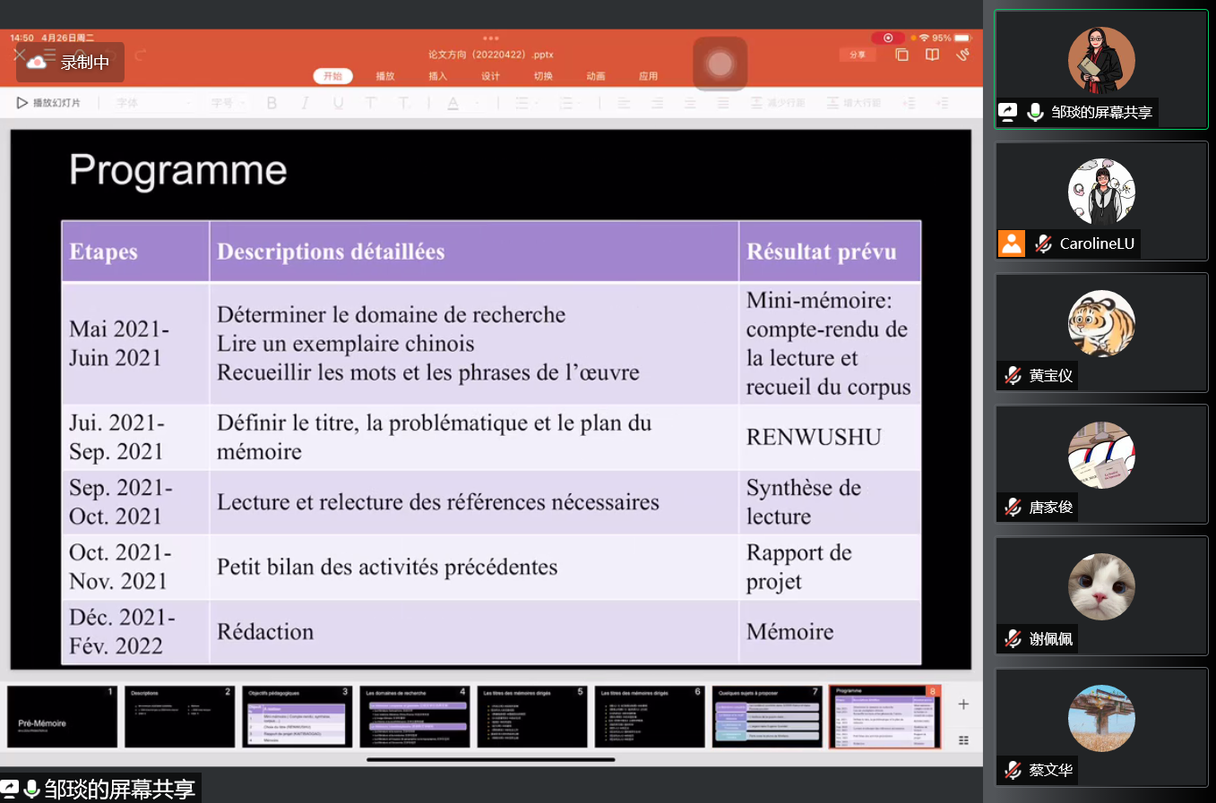 2022年4月26日下午2点High漫画 法语专业在腾讯会议平台(会议号:219-953-380)举办19级毕业论文动员大会暨导师见面会。导师们依次向学生介绍自己的研究领域、研究方向、论文写作要求等。邹琰主任简要介绍了接下来的论文工作布局,向同学们提出如下要求:要把学术论文撰写当成一个提升自己的平台,做到理论与实践相结合。
