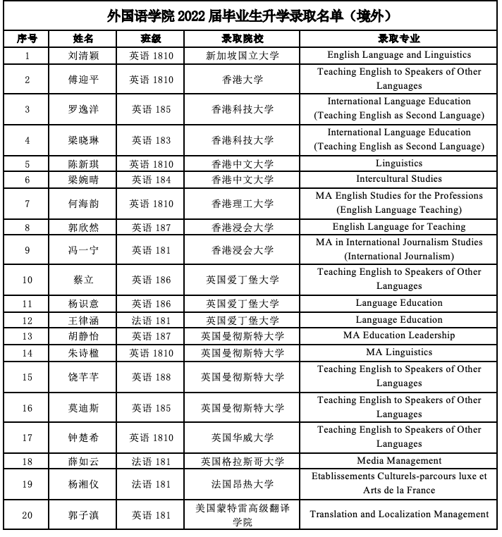 2022届毕业生共338人,其中123人参加了今年的全国研究生入学考试,最终录取人数为30人,另有20人被国(境)外高校录取,总录取率达14.5%。