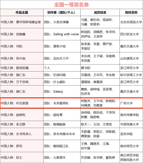 英语专业2021级学生团队的作品《叶氏家族》(团队成员:柯智杰、王宇成、陈晓阳、何镇源、邓雅雯)荣获全国一等奖,彭欢老师和皮强老师荣获指导教师一等奖。