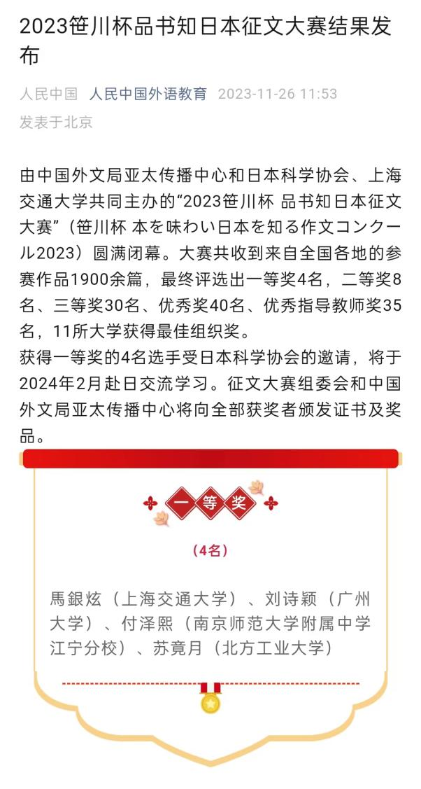 东语系日语211班刘诗颖荣获一等奖,山中泉老师荣获优秀指导教师奖。获得一等奖的4名选手受日本科学协会的邀请,将于2024年2月赴日交流学习。
