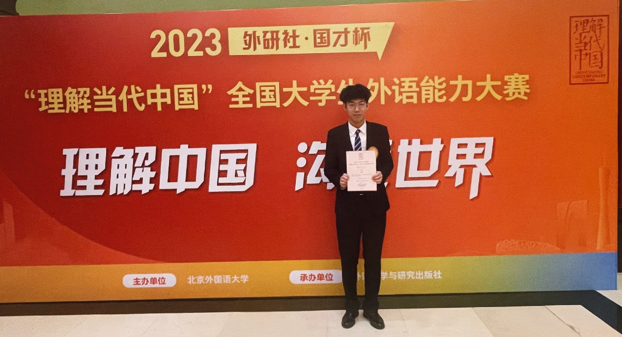 日语专业2021级林家和、2020级梁芷欣两位同学,分别以广东省赛区第一、第二的好成绩,双双晋级国赛第一轮。经过激烈角逐,2021级林家和脱颖而出,成功晋级全国总决赛,在晋级总决赛的3名广东省选手中位列第一。多语种组全国总决赛综合考查选手的口译、即兴演讲等能力,要求选手们结合学习经历,讲述自己理解中国、沟通世界的故事。在12月7日的总决赛中,林家和同学充分展现了训练成果,发挥稳定,沉着冷静地向评委们讲述了自己的“中国梦”,展现了当代青年的风采,最终获得银奖。
