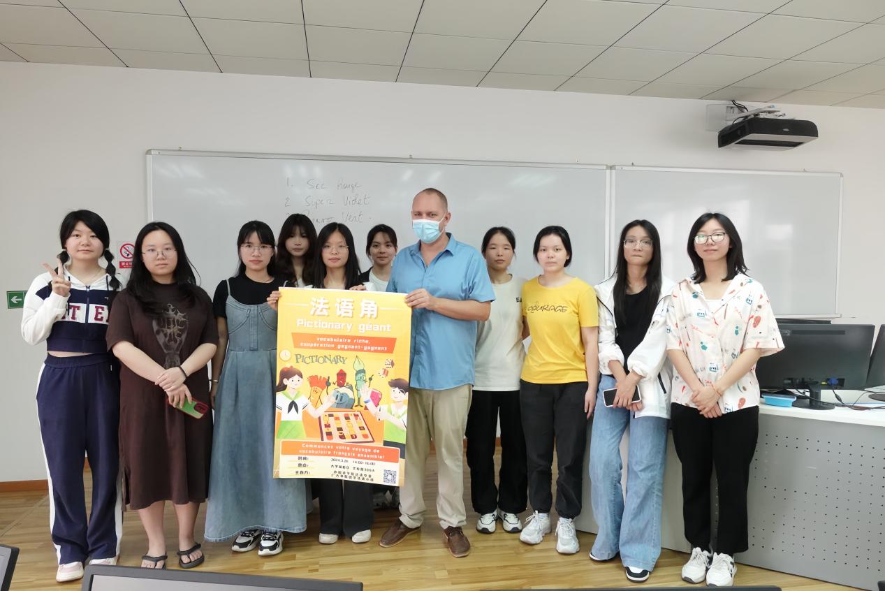 3月26日下午两点,High漫画 法语专业在大学城校区文俊西A306成功举办了法语角活动“巨型词典”。本次法语角由外教Sébastien Damry老师主持,参与人员为法语专业23级和22级部分学生。活动伊始,Sébastien Damry老师详细讲解了“巨型词典”的游戏规则,学生们知悉游戏规则后,分小组展开了游戏。最终第一组同学取得胜利。 通过本次活动,学生不仅丰富了词汇量,还增强了团结精神和团队协调能力。
