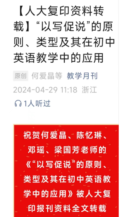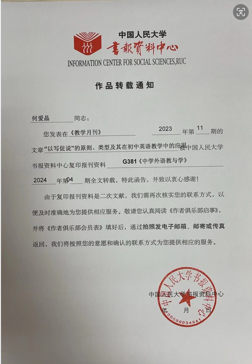 何爱晶教授指导本科生陈忆琳、邓瑶发表于《教学月刊(中学版)》(2023年第11期)的论文《“以写促说”的原则、类型及其在初中英语教学中的应用》被中国人民大学复印报刊资料(以下简称“人大复印资料”)《中学外语教与学》2024年第4期全文转载。