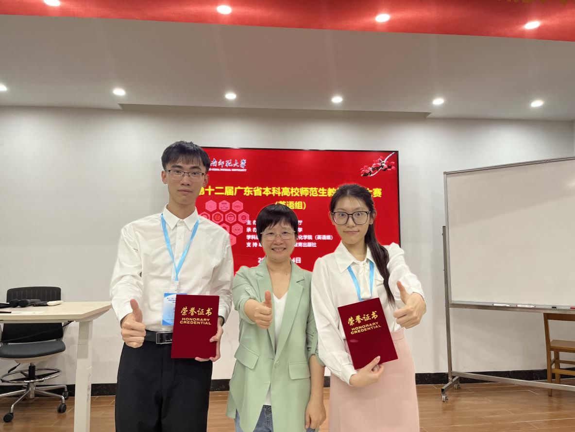 派出三名2021级英语师范专业学生参加本届比赛,陈丽虹老师担任指导老师。经过激烈的半决赛选拔后,有两位选手晋级获得现场决赛资格。决赛阶段,陈丽虹老师与杨冬玲老师共同带队,最终两位选手在16所高校的26位选手中脱颖而出。其中,英语(师范)218班何镇源同学获得一等奖、英语(师范)217班唐宽婕同学获得三等奖。