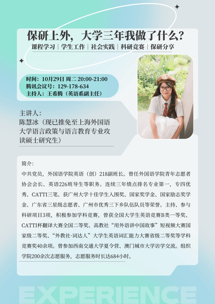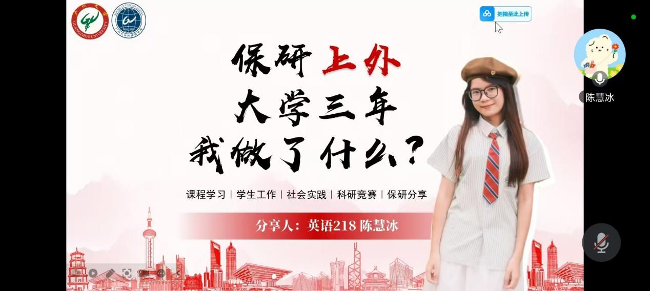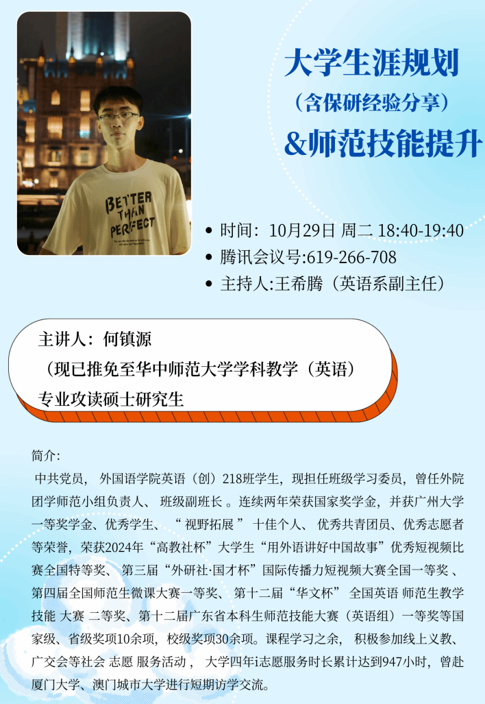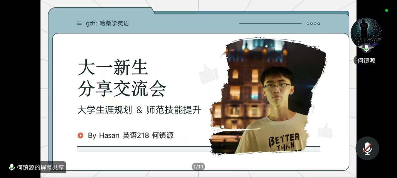 英语(师范)专业大四推免生何镇源和陈慧冰两位同学在线上为大一新生作了有关大学生涯规划、师范技能提升及保研经验的分享。本次活动由英语系副主任王希腾老师主持,100多名英语及英语(师范)专业学生参加。