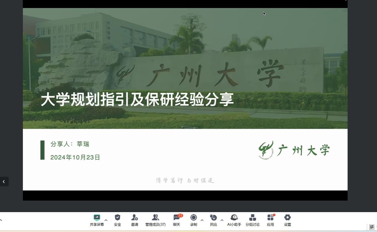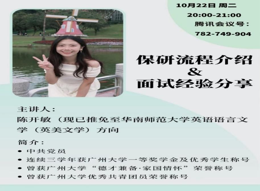 英语专业大四推免生莘瑞和陈开敏两位同学在线上为大一新生做了有关大学学习规划、保研准备及面试流程的分享。本次活动由英语系主任陈姝老师主持,100多名24级英语专业学生参加。