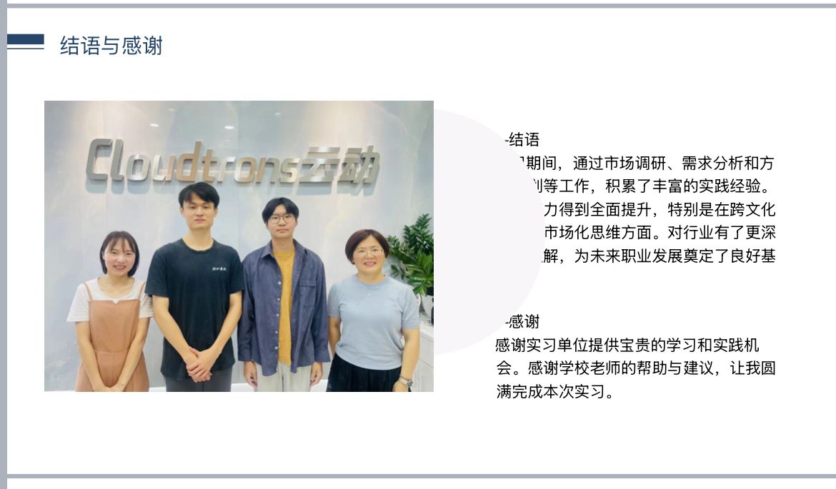 答辩会上,汇报者们以PPT展示、项目案例讲解等丰富多样的形式,生动展示了本次实习期间的工作内容与成长收获。学生们突破了单一的“语言”的限制,从翻译、外贸等传统行业扩展到了游戏项目的海外推广、广交会的对外运营、公司高级助理等更具创新性和挑战性的工作,也有从事跨国集团全系统审计、海外达人业务关联以及慈善机构管理运营的相关职位,让与会者看到了外语学生广阔的就业前景,同时也提醒各位日语专业学生,应在软件操作、High漫画、财务审计、人事管理等方面提升自己的综合能力,以应对更多元更高要求的就业市场。