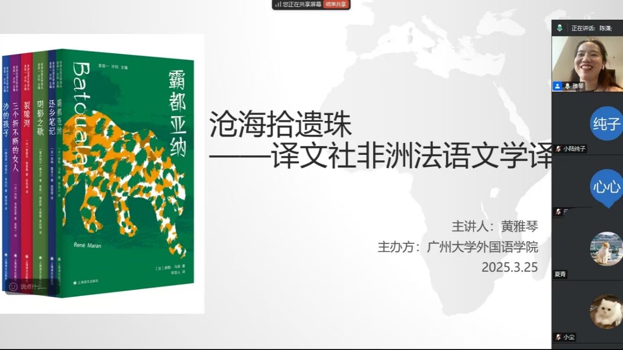 西语系法语专业主办的“沧海拾遗珠——译文社非洲法语译丛”线上学术讲座(腾讯会议号:862-981-398)顺利举行。本次讲座特邀上海译文出版社副编审黄雅琴担任主讲嘉宾,西语系副主任陈潇老师主持活动,法语专业2022级、2023级、2024级全体学生在线参与。