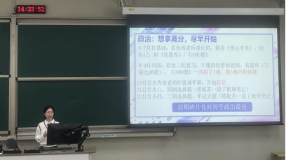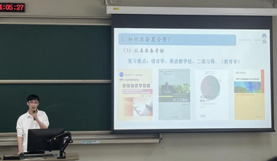 随后,成功考取本校学科教学(英语)专业的黄菀蜓同学分享了她的考研心得。她从目标定位、备考策略和心理调适三个维度展开,着重强调了明确目标院校、反复研习真题以及保持积极心态的备考要诀。