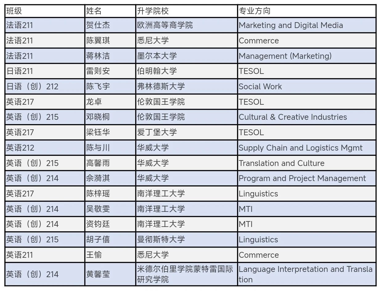 始终秉持“以生为本”的教育理念,通过构建“导师引领方向、朋辈协同成长、学院全程护航”三位一体的培养体系,为学生提供全方位成长支持。2025届本科毕业生升学成绩斐然,共有82人成功深造,升学率达23.91%,其中法语专业毕业生升学率为34.48%,创历史新高。