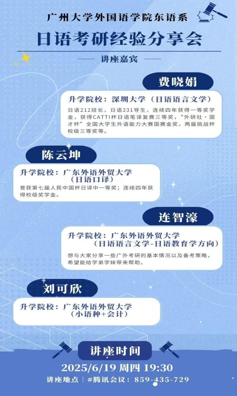 成功举办了一场日语考研经验分享会。此次活动邀请了 4 位日语专业 2025 届优秀毕业生作为嘉宾,他们围绕考研准备、学习方法以及心态调整等关键方面,毫无保留地分享了自己的成功经验,吸引了众多日语专业师生踊跃参与。