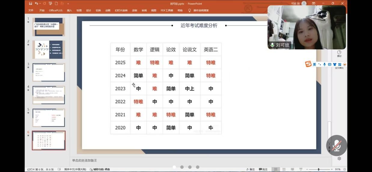 刘可欣同学则被广东外语外贸大学小语种 + 会计专业录取。她在分享会上展示了对近年该专业考试难度的分析情况,为备考同学提供了清晰的考试难度趋势参考。作为跨专业考研的成功典范,刘可欣极大地鼓舞了学弟学妹们大胆尝试跨专业考研的勇气。
