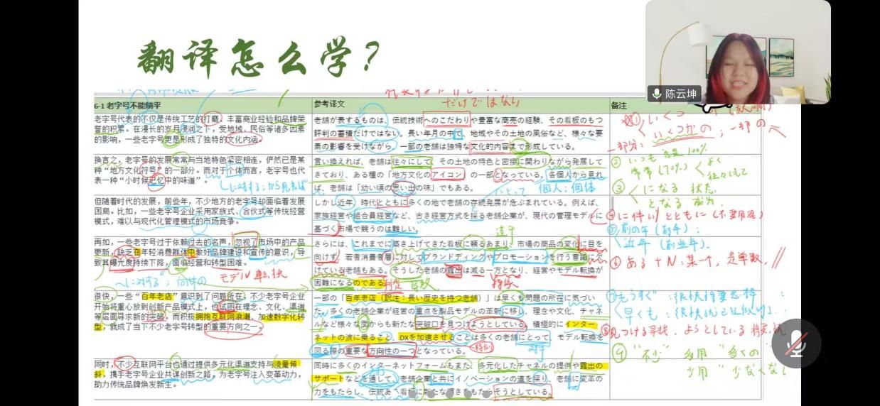 陈云坤同学被广东外语外贸大学日语口译专业录取。她曾荣获第七届 “人民中国杯” 日译中一等奖,连续四年获得校级奖学金。在分享会上,陈云坤聚焦日语口译考研技巧与口译实践能力提升方法,为同学们提供了极具价值的参考。