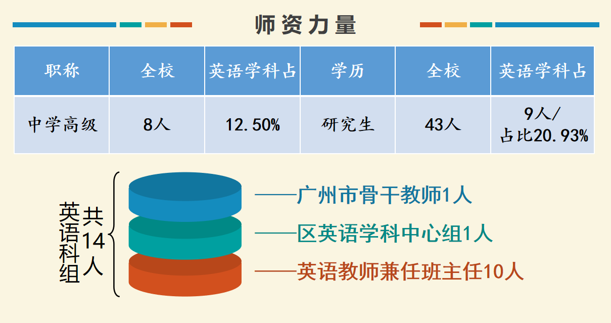 广州市执信中学琶洲实验学校坐落在琶洲互联网创新聚集区,拥有优良的社区环境,是一所九年一贯制的学校。学校占地总面积为30293.6方米,设有小学部和中学部共41个教学班,现有学生1671人,教师115人。是一支年轻有活力的队伍。博士学历1人,占0.87%,研究生学历61人,占53.04%,本科学历51人,占44.35%,专科学历2人,占1.74%,学历达标率100%。高级教师8人,南粤优秀教师1人、广州市“百千万人才培养工程”培养对象5人,广州市骨干教师1人,教坛新秀2人,广州市、海珠区教研室学科中心组成员等区级以上骨干教师14人。