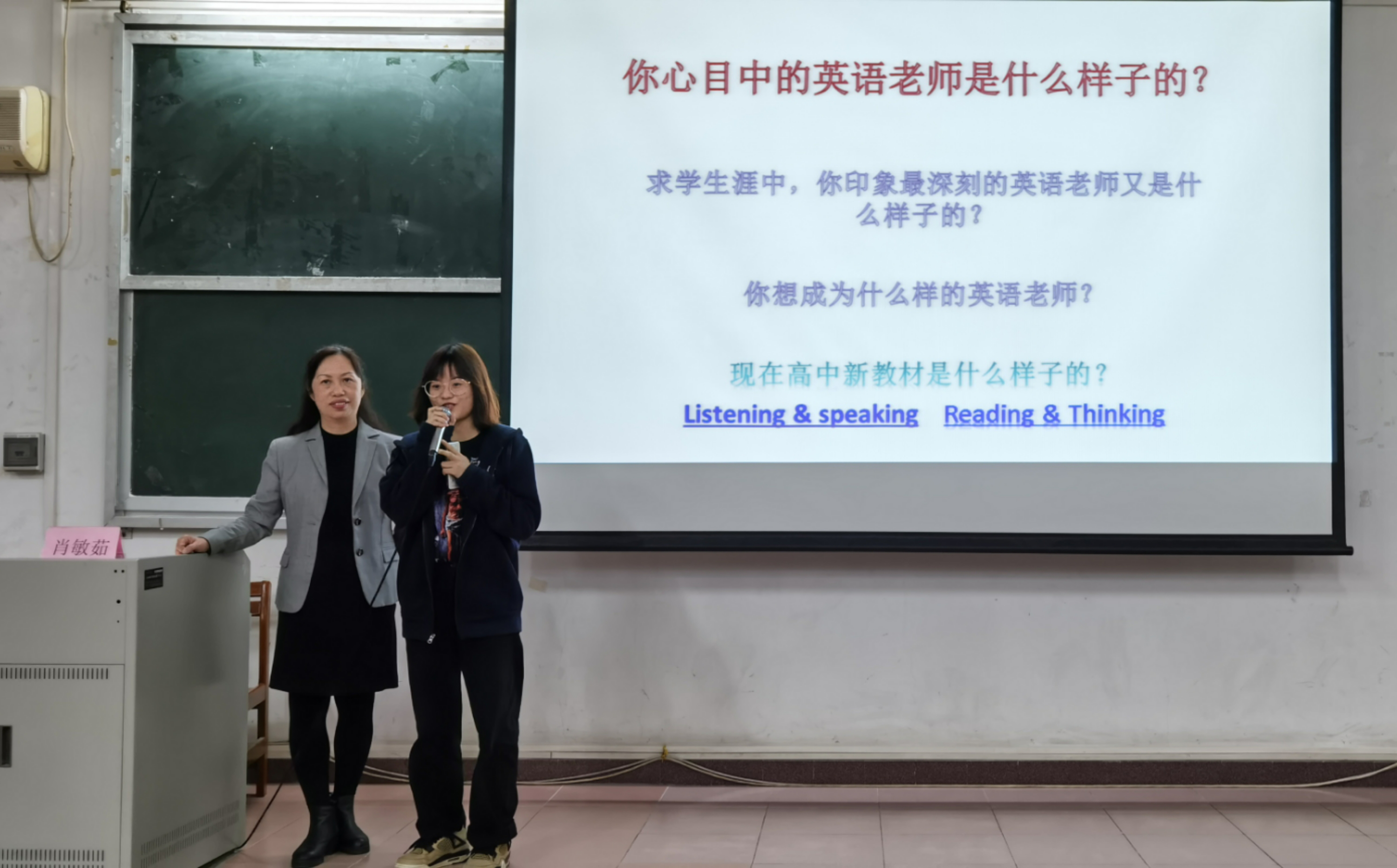 首先,肖敏茹老师通过小互动,引导同学们思考:你心目中的英语老师是怎样的、英语老师应该具备什么品质、你想成为怎样的英语老师。接着,她介绍了基础教育英语新课程标准的目标是培养中学生的英语学科核心素养,其内涵包括了语言能力、文化意识、思维品质和学习能力,也是师范生努力的方面。肖老师指出了当前英语课堂需要注意的问题,以及英语老师专业发展需要的具备的关键能力,分别是语言能力、整合资源能力、跨界思维、审辩性思维、深入学习等能力,培养学生用英语讲好中国故事。肖老师亲切给同学们分享了有益于英语学习的工具,如:TED, Podcast, Audio book等。